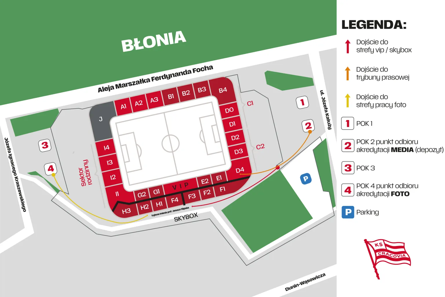 Odbiór wszystkich akredytacji medialnych odbywa się w Punktach Obsługi Kibica od strony ul. Józefa Kałuży (mapka poniżej). Odbiór akredytacji możliwy przed każdym meczem na 2 godziny przed jego rozpoczęciem.