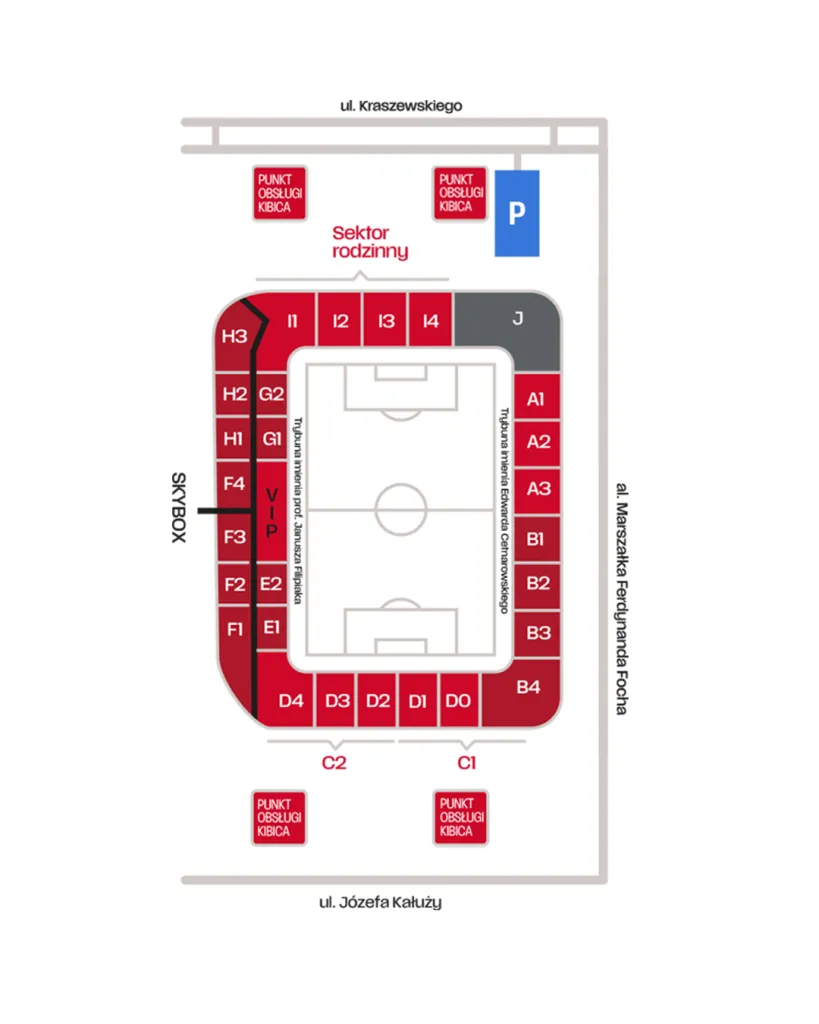 Preferujesz dojazd na stadion rowerem? Mamy dla Ciebie idealne rozwiązanie w postaci stojaków, gdzie na czas meczu będziesz mógł zostawić swoje "dwa kółka" i cieszyć się w spokoju piłkarskim widowiskiem. Stojaki znajdują się przy Oficjalnym Sklepie Cracovii (al. Focha) oraz przy wejściu na trybuny A i B.