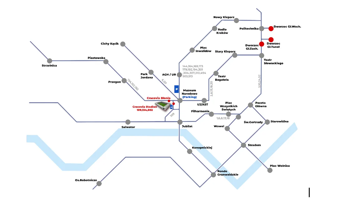 124, 144, 152, 164, 169, 173, 179, 194, 292, 304, 409, 424, 503., 601, 605, 608, 611, 902 (przystanek „Muzeum Narodowe") 109, 134, 502, 504 (przystanek „Cracovia Stadion").